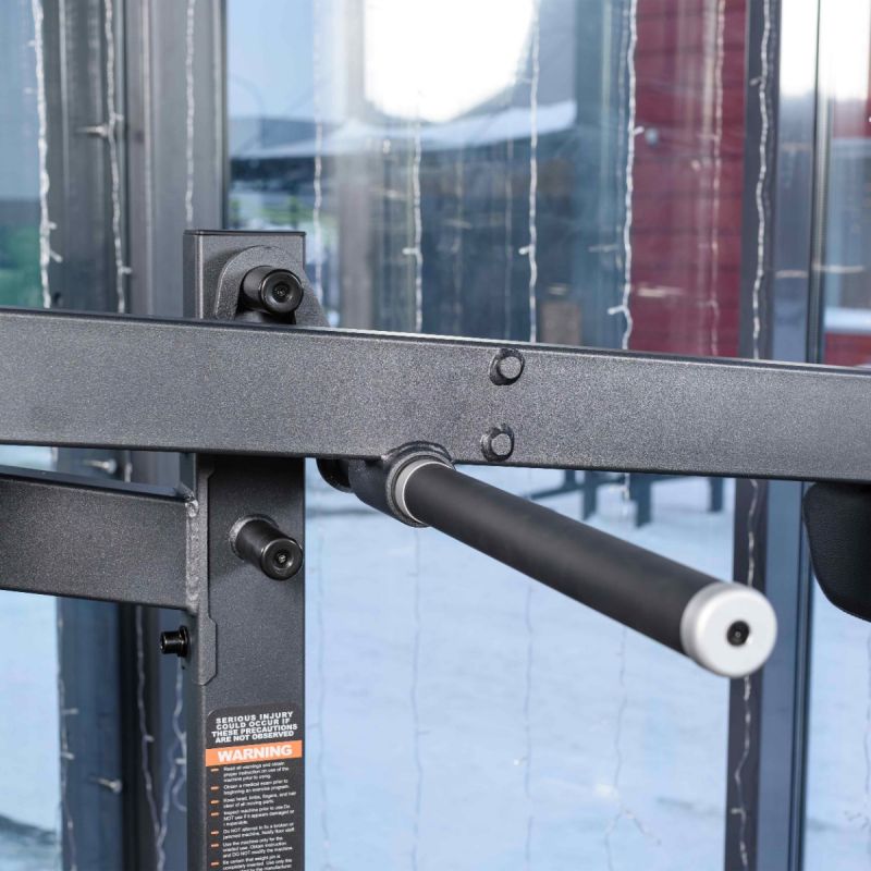 - Для безопасного начала и завершения подхода предусмотрен стартовый рычаг, расположенный на уровне подплечников. Стартовый рычаг фиксируется в двух положениях (выше/ниже), удерживает подвижный узел и позволяет пользователю комфортно занять стартовое положение и безопасно завершить упражнение.