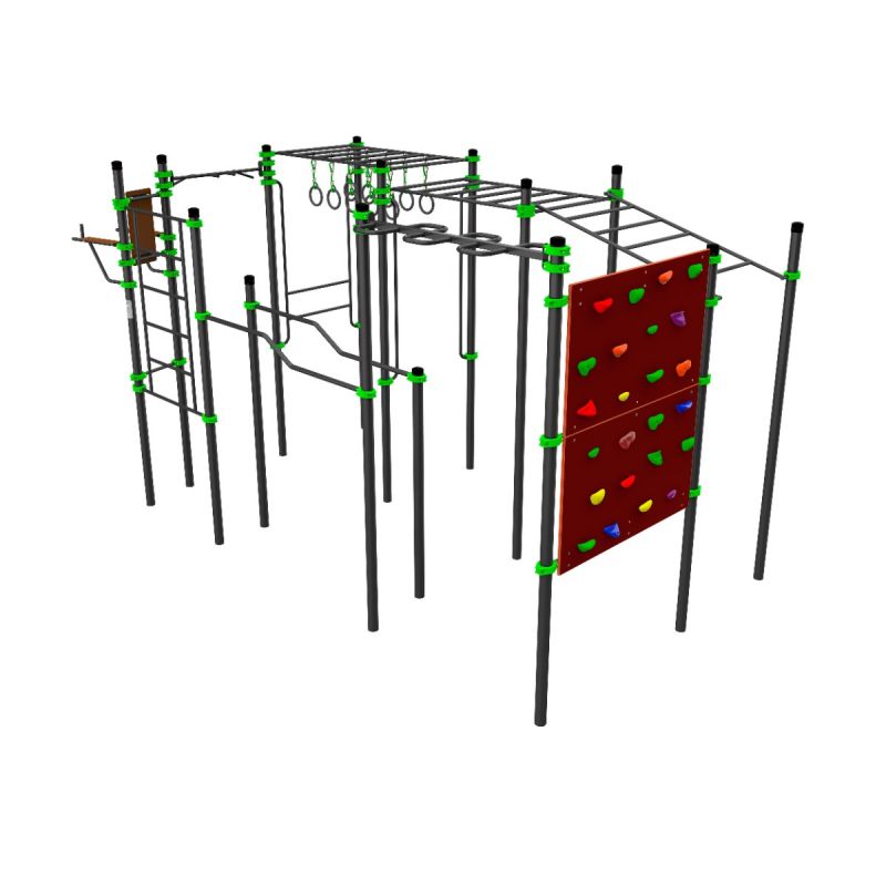 Большой тренировочный комплекс, объединяющий сразу несколько снарядов: рукоходы, шведскую стенку, брусья, турники, рукоход-кольца и элементы для развития ловкости и силы. Подходит для проработки всех основных мышечных групп, функциональных тренировок и подготовки к выполнению нормативов ВФСК «ГТО». Конструкция рассчитана на одновременные занятия нескольких пользователей.