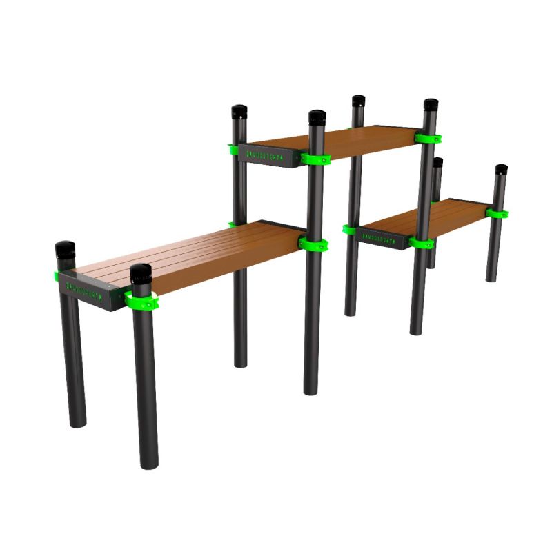 Функциональный элемент для тренировок на пресс и отжиманий. Три скамьи разной высоты дают возможность варьировать интенсивность нагрузки, использовать их как по отдельности, так и в связке – например, для круговой тренировки. Подходит для тренирующихся любого уровня подготовки.