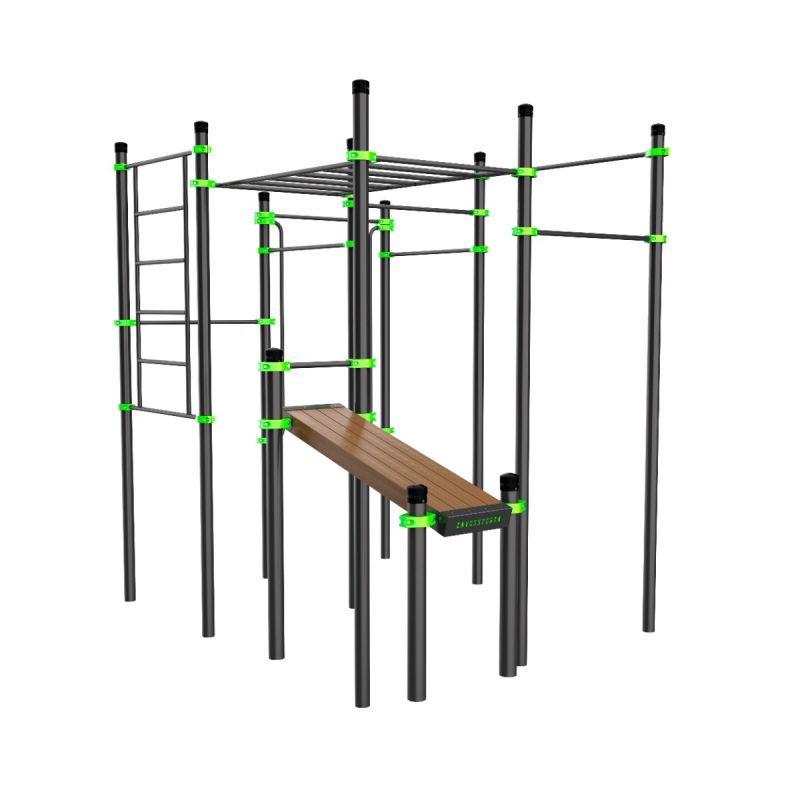 Многофункциональный тренировочный комплекс, рассчитанный на полноценную проработку всего тела. Вертикальные перекладины, наклонная скамья для пресса, классический горизонтальный рукоход и семь турников различной высоты позволяют выстраивать целые серии упражнений на силу, выносливость и координацию. Комплекс рассчитан на одновременные занятия до 10 человек.