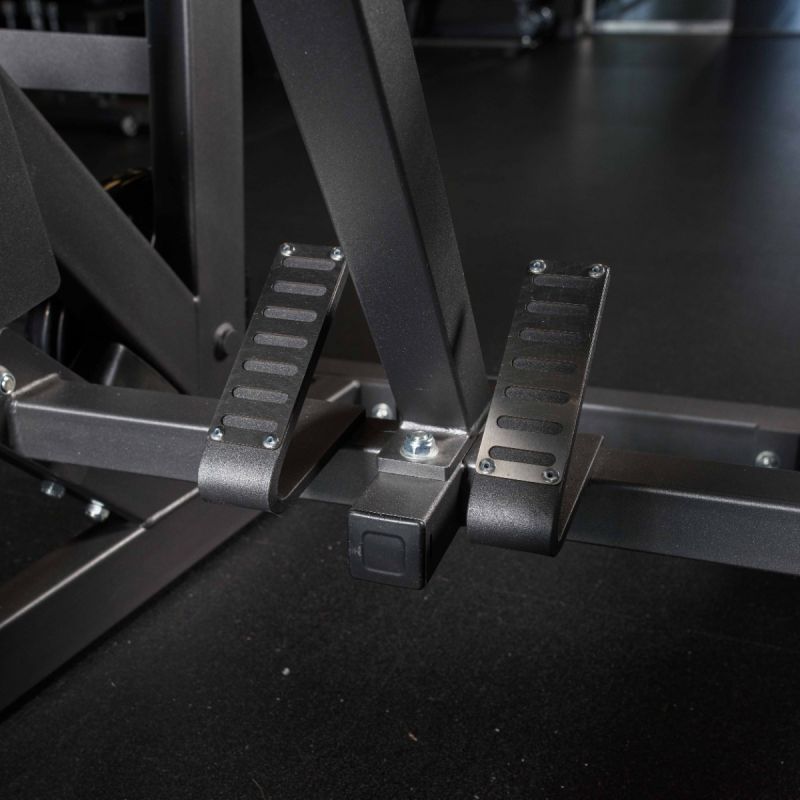 - Тренажер имеет четыре опорные ножки из стального листа с отверстиями для крепления к полу.
